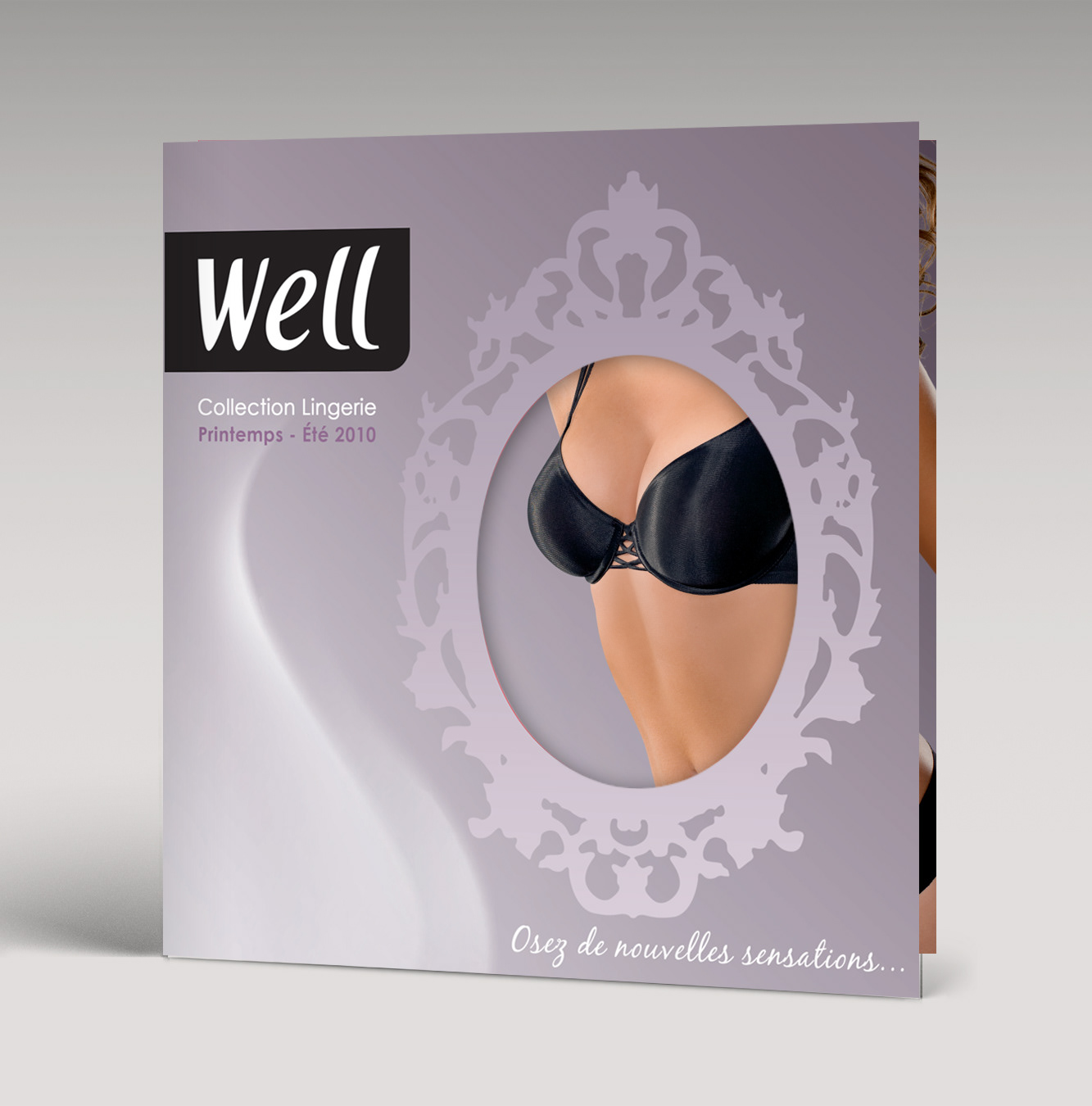 Création d'une pochette contenant des fiches produits, à destination des forces de vente Well. Demande d'un outil féminin et poudré, avec un effet teasing, créé par la forme de découpe.